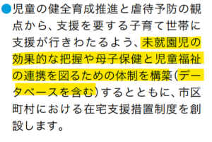 子育て家庭に必要な支援を届けるために、ここに書かれているようなデータベースの構築が重要です。全国の子育て家庭の状況(住民記録、生活保護、幼児保育・教育、行政等が行った支援内容等)をデータベースに記録し、国・自治体・関係機関が閲覧できるようにすることで、支援の必要な家庭に対し、積極的に支援を届けられるようになります。