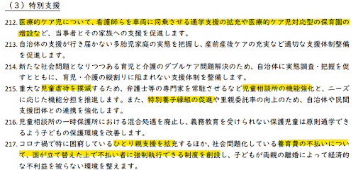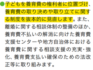 子どもの貧困の主犯格の1人である、「養育費の不払い」について、ちゃんと制度の「抜本的見直し」を入れているのが偉い。上(立憲)にも書いたとおり、韓国のような養育費立替払制度の導入がマストです。