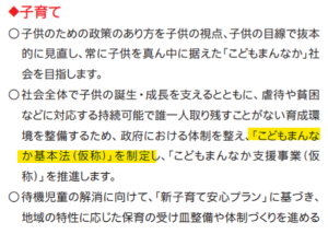 まず、「子どもの権利の保障を基本理念」として、「子ども総合基本法の成立」、「子育て支援予算の拡充」、そして「こども省の設置」にも言及がある点はGOOD!!
