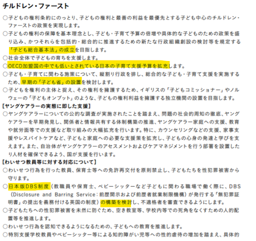 公明党も、「子ども家庭庁」の創設、性犯罪者から子どもたちを守る「日本版DBS」、そして、医療的ケア児の保育園等での受入れに言及している点は良いです。