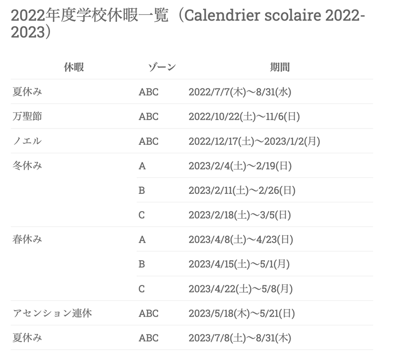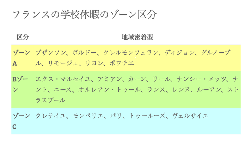 フランスの学校は、地域ごとにAゾーン・Bゾーン・Cゾーンに分けて、それぞれちょっとずつズラしてお休みを設定しているそうなんですね。
