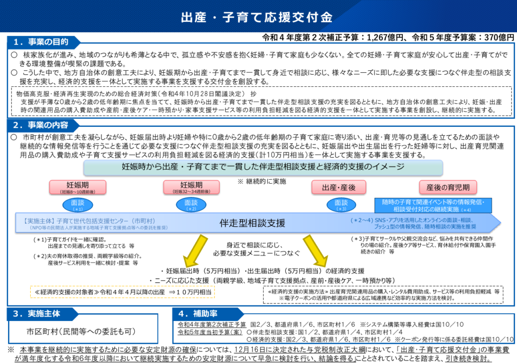 「 妊娠期から出産・子育てまで、身近な場所で相談に応じ、多様なニーズに応じた支援につなぐ「伴走型相談支援」について、地方自治体の取組と課題を踏まえつつ、継続的な実施に向け制度化の検討を進める。その際、手続等のデジタル化も念頭に置きつつ制度設計を行う。」