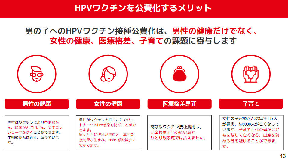 男性へのHPVワクチン公費化により、男性の健康だけでなく、女性の健康などにも寄与することを説明。