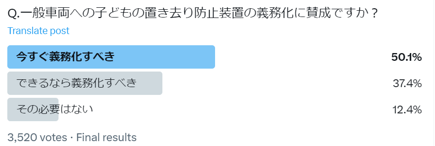 この調査結果からも、日本でも「一般車両への置き去り防止装置義務化」の意識は高まっていると言えるのではないでしょうか。