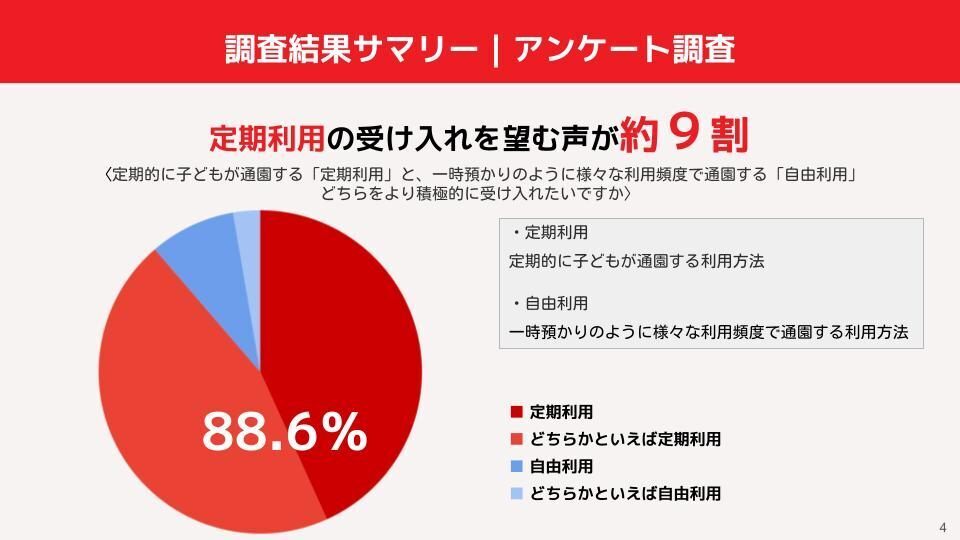 「こども誰でも通園制度」の制度設計の大きな論点のひとつである利用形態について、保育事業所へ定期的に子どもが通園する「定期利用」と、一時預かりのように様々な利用頻度で通園する「自由利用」、どちらをより積極的に受け入れたいかを尋ねたところ、「定期利用」の受け入れを望む声は約9割という結果となりました。