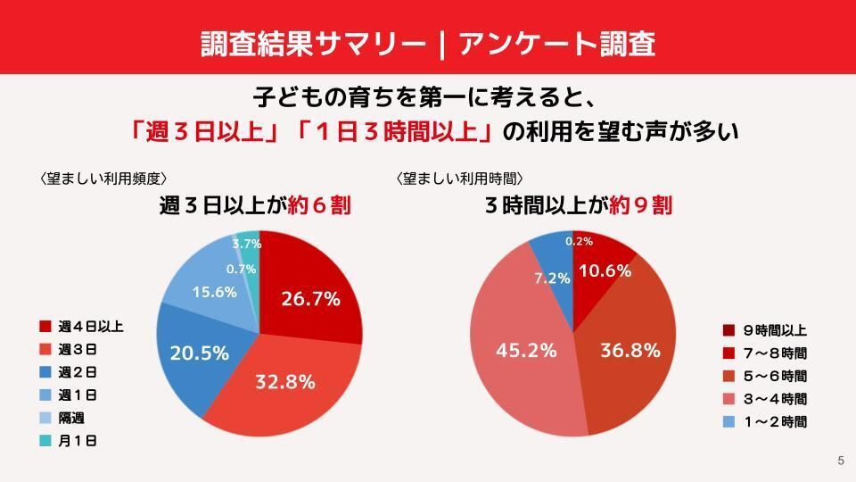 「定期利用の場合、子どもの育ちを第一に考えた際に、1人につき望ましい利用頻度・利用時間」を尋ねたところ、利用頻度については「週4日以上」26.7%、「週3日」32.8%と「週3日以上」が合わせて59.5%にのぼりました。また、1日あたりの利用時間については、「3~4時間」45.2%、「5~6時間」36.8%、「7~8時間」10.6%など、「3時間以上」の回答が9割を超えました。