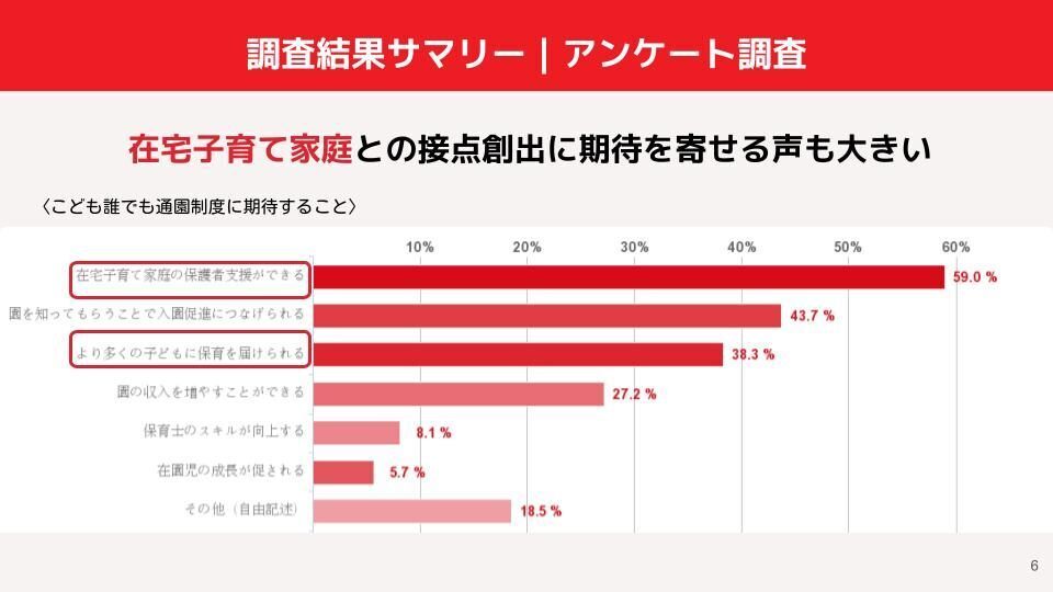 (期待することは)就労の有無や複雑な条件によらず子どもを預けられること。誰でも安価で利用できること(収入が多いからといって過剰な負担をさせる仕組みにはしない)。預かる側にも金銭的メリットが生じるようにすること。保育者の配置基準を見直すこと。子育て支援と少子化対策の予算を増やすように政治に働きかけること。