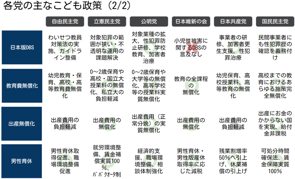 子育て家庭のみなさんが気になるであろう「こども・子育て支援政策」ですが、改めてよくよく眺めてみると、各党の特徴が出ていて面白いです。