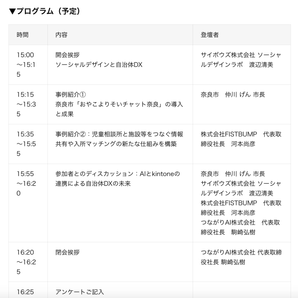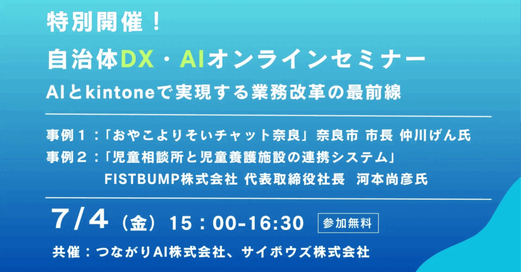 つながりAI株式会社(本社:東京都港区、代表取締役:駒崎弘樹)は、サイボウズ株式会社(本社:東京都中央区、代表取締役社長:青野慶久)との共催で、自治体職員向けのオンラインセミナー「【特別開催!自治体AI・DXオンラインセミナー】AIとkintoneで実現する業務改革の最前線」を2025年7月4日に開催することをお知らせいたします。