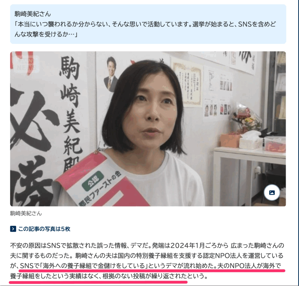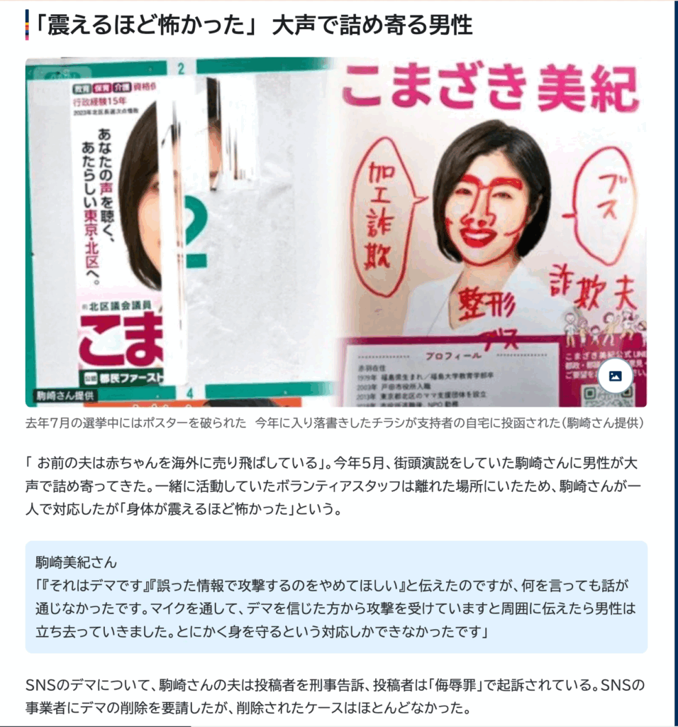 私の妻である東京都議会議員・こまざき美紀にも、そのデマの影響が及びました。デマを信じた人から怒鳴られたり、嫌がらせをされたり。